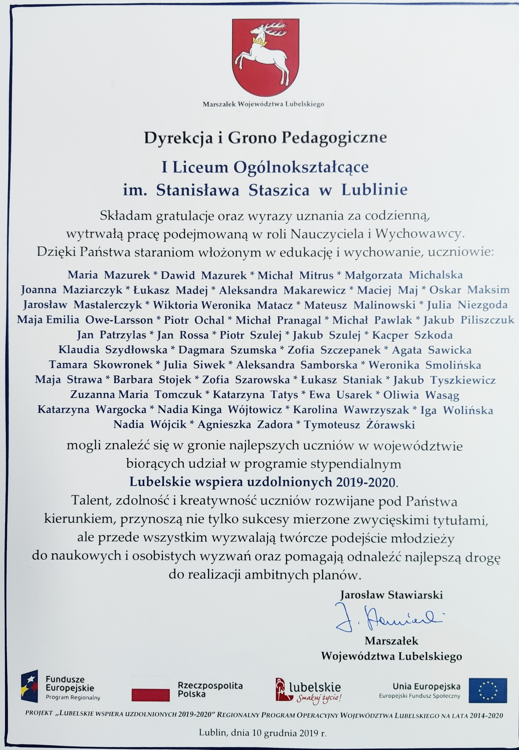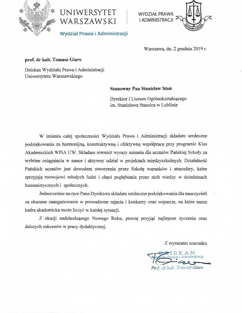 Martyna Łusiak z II F zajęła pierwsze miejsce, a Maksymilian Grądz IBG drugie miejsce w etapie okręgowym Olimpiady Wiedzy o Unii Europejskiej. Olimpiada odbyła się 30 listopada 2019 r. w Zamościu. Warto zaznaczyć, że nasi licealiści uzyskali kolejno 3 i 4 wynik w kraju!