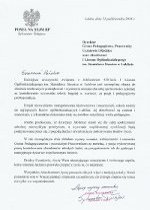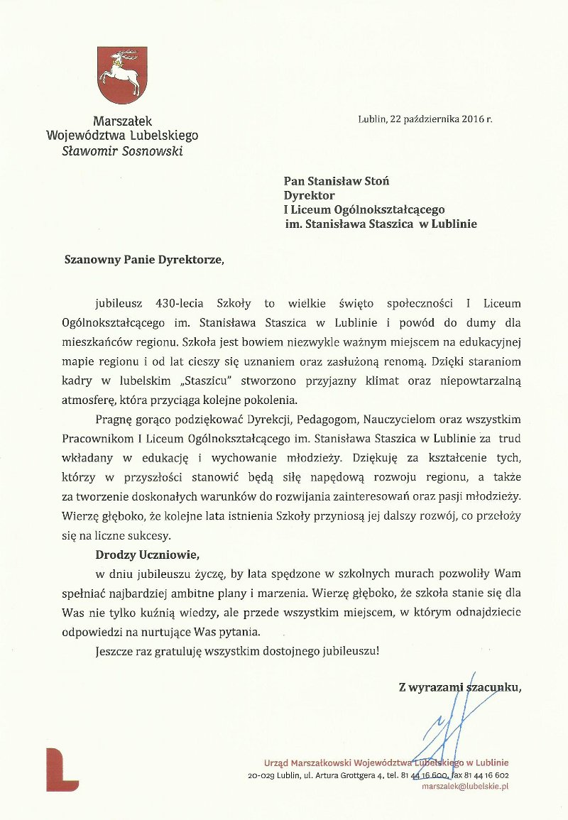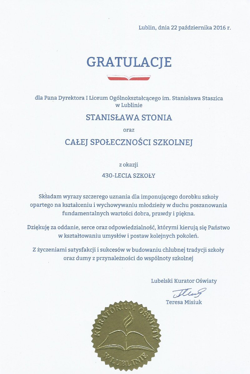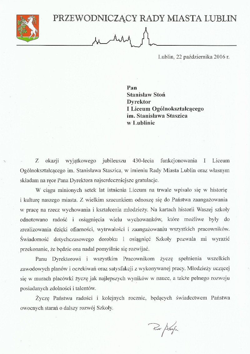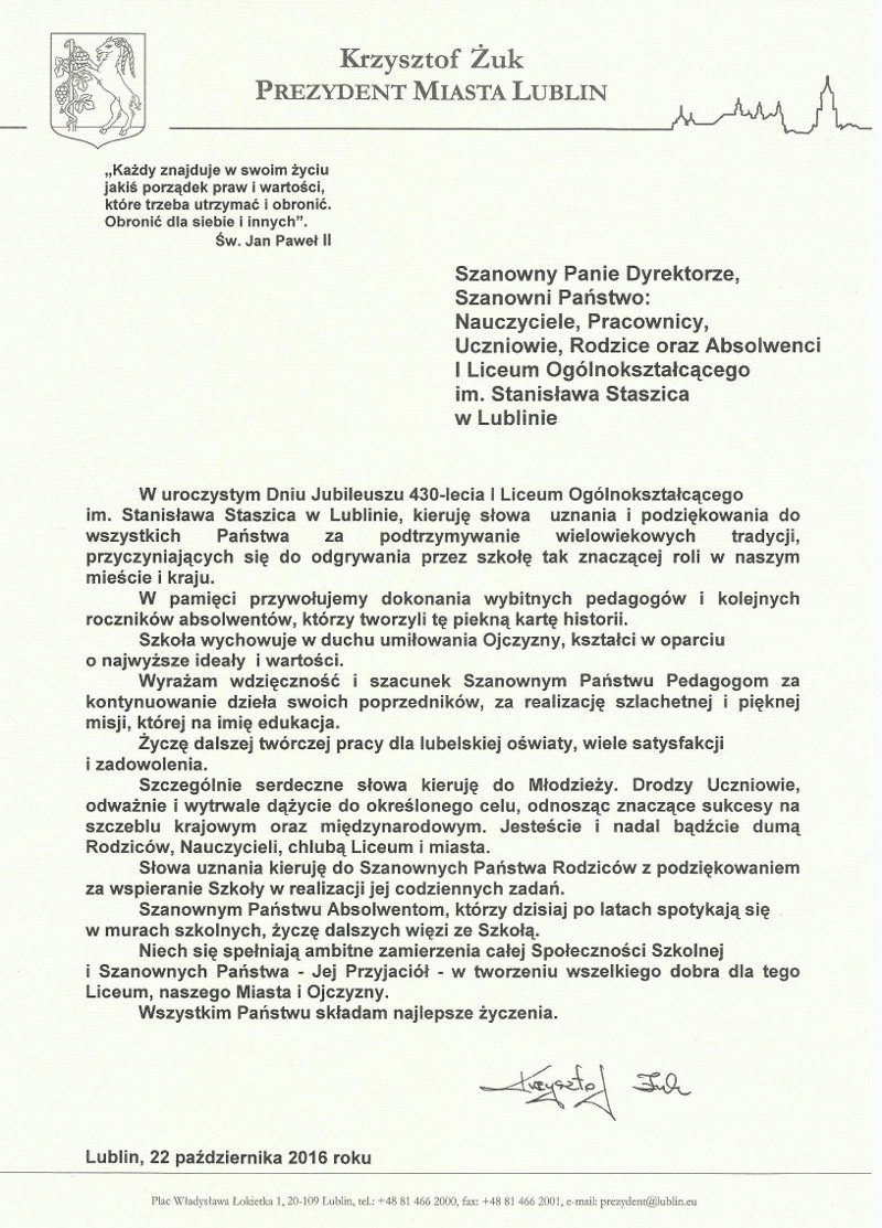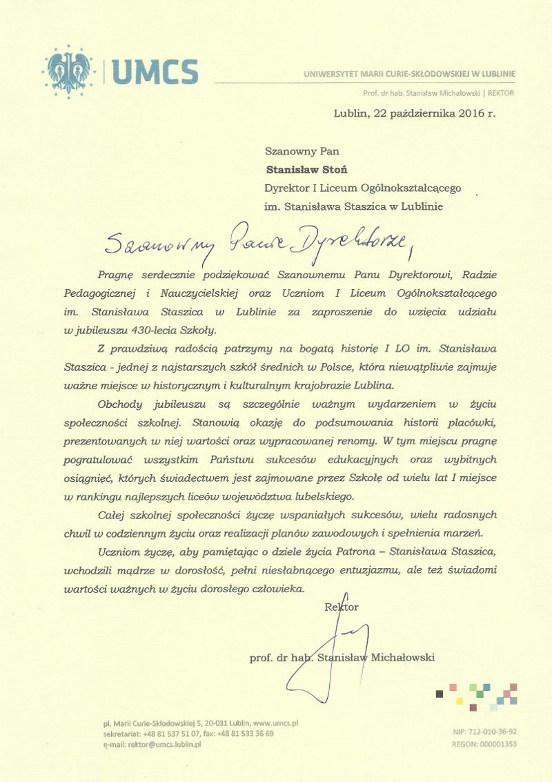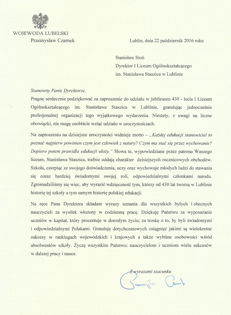 W kronice szkolnej dzieÅ„ 22 października 2016 roku zostanie utrwalony jako dzieÅ„ jubileuszu, a zÅ‚ożone na rÄ™ce dyrekcji gratulacje bÄ™dÄ… to po wsze czasy potwierdzaÅ‚y. Oto niektóre z tych listów: